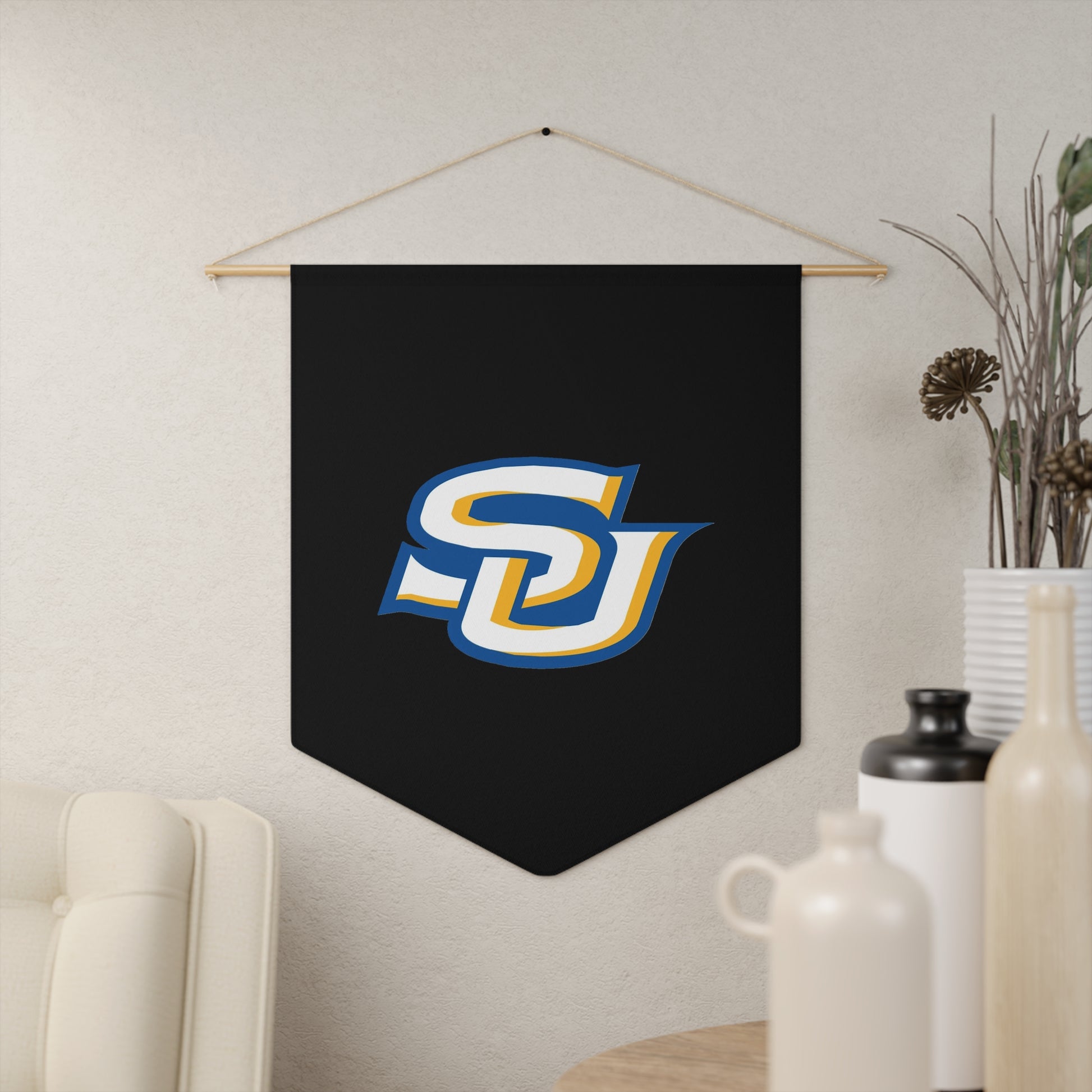 Made to uplift any room with a touch of character, these personalized pennants can be fully customized your artwork. Each pennant comes with a wooden dowel for easy hanging. They're lightweight and highly durable for decor that looks stunning in the long run.